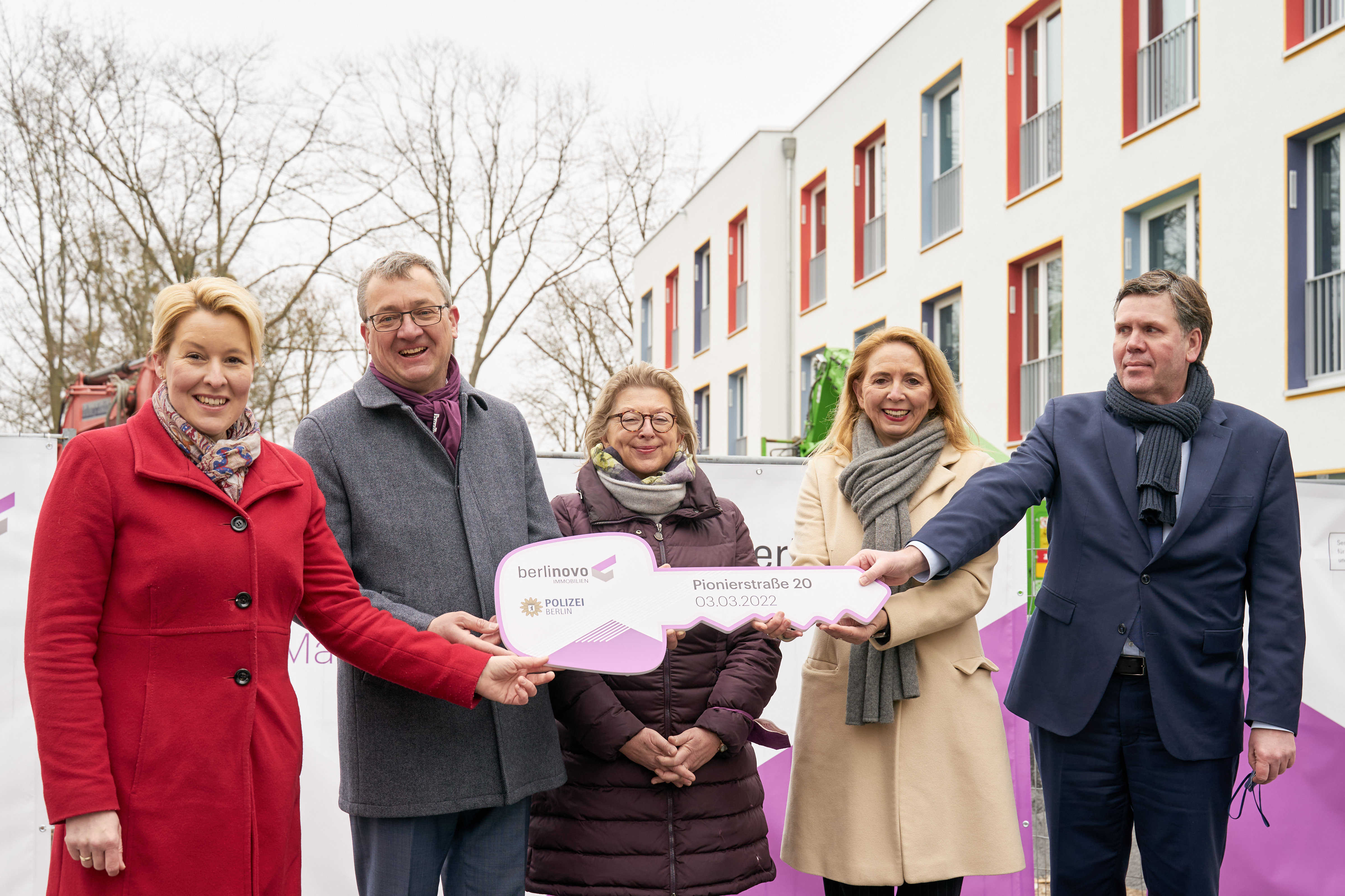 Der Geschäftsführer der berlinovo Alf Aleithe hat heute im Beisein der Regierenden Bürgermeisterin, Franziska Giffey und dem Staatssekretär für Inneres, Torsten Akmann, der Polizeipräsidentin Dr. Barbara Slowik symbolisch den Schlüssel für das Apartment-gebäude für Anwärterinnen und Anwärter des Polizei- und Feuerwehrdienstes übergeben.